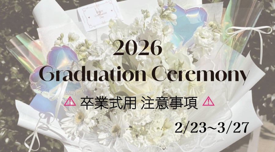 毎年大人気♡ 2月3月限定販売の卒業式用heart ballon bouquet♥︎ オーロラのハートバルーン・包装紙を使ったとびきり可愛い花束です♥︎ 卒業カード付きになっております。 ※ご来店日をご選択の上備考欄に受取目安時間の記入を必ずお願いいたします 一生に一度の卒業式でプレゼントされたら思い出に残ること間違いなし! お友達とお揃いで持っても可愛い...♡ ラッピングのお色のご指定がある場合は備考欄にお書きください。 ご指定がない場合お花に合わせてラッピングさせていただきます! ※商品一覧にある「ご注文前に」の文章を必ずご一読下さい。 購入頂きましたら、ご一読頂いたと認識させて頂きます。 ※白バラはクリームに近いお色味になります。 ※紫・水色・青のお花はお花専用のスプレーで染めさせて頂きます。 ※バラは色によって輪の大きさに個体差ございます。 ※5~10月は暖かくなる季節ですのでクール便をおつけして頂くことをお勧めいたします。 ※当店スタッフが1つ1つ手作業でお作りしておりますので個体差が生じてしまいます。1つ1つ心を込めて可愛くお作りします♡