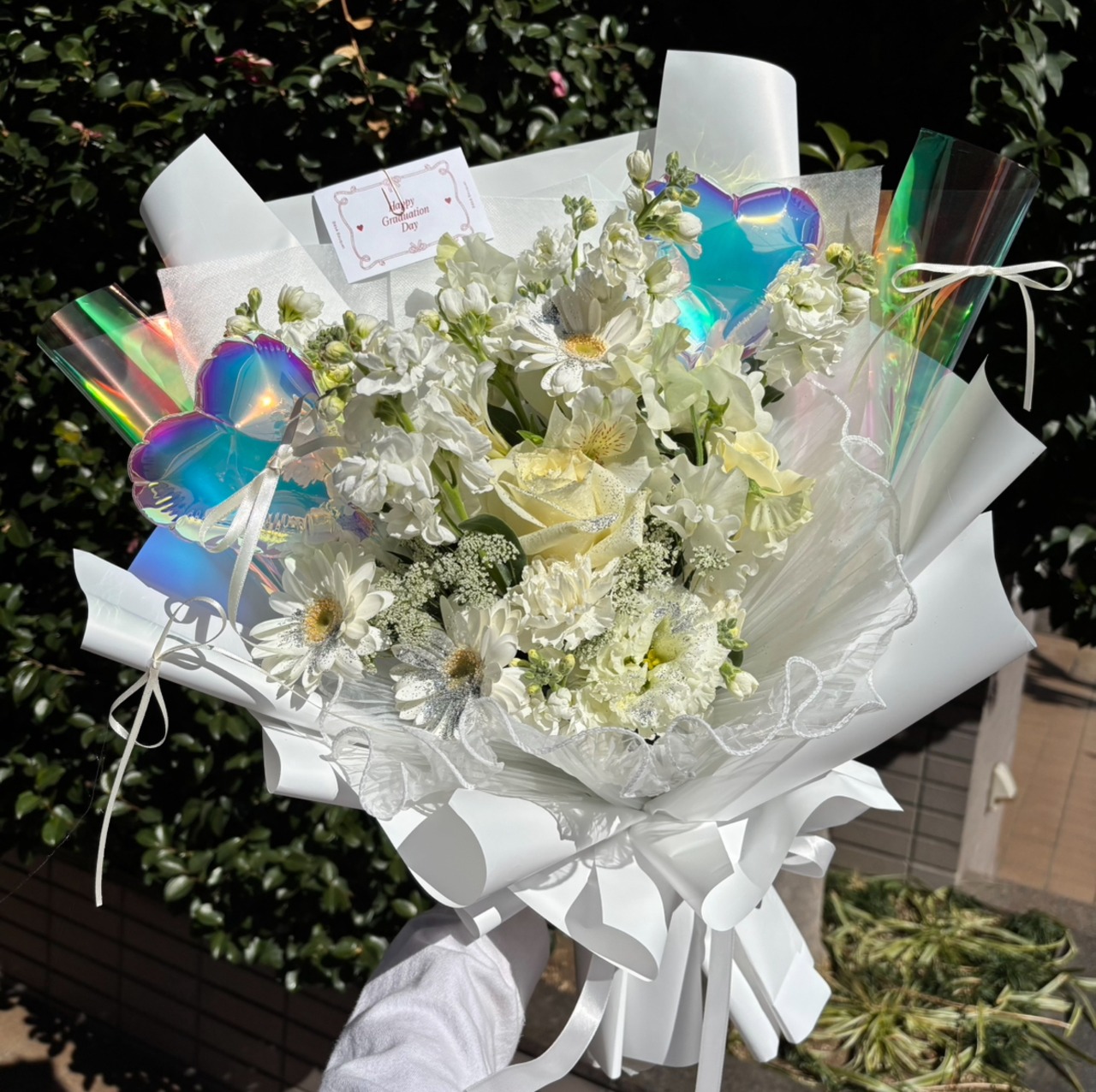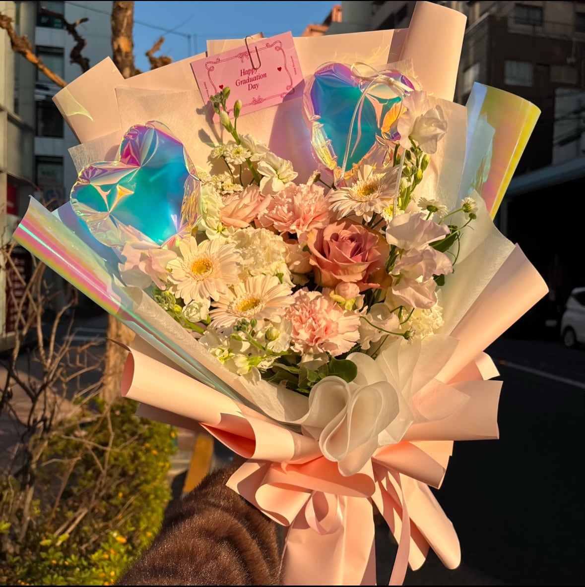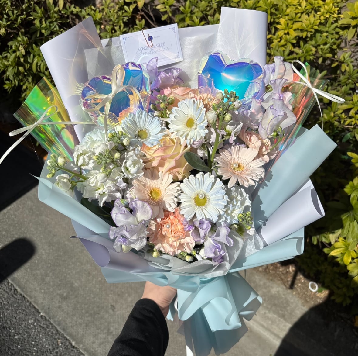オーロラのハートバルーン・包装紙を使ったとびきり可愛い花束です♥︎